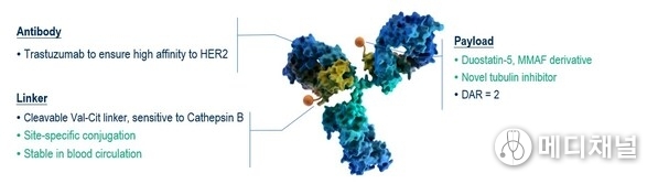 Trastuzumab botidotin is a HER2-targeted ADC composed of a cytotoxic drug (Duostatin-5, anti-microtubule agent) with site-specific conjugation to trastuzumab via a stable protease-cleavable valine-citrulline linker. The unique linker is stable in plasma and selectively cleaved by lysosomal cathepsin B that is up-regulated in cancer cells.