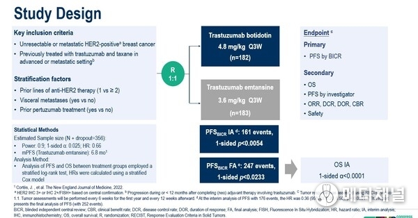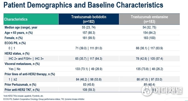 In this study, a total of 365 patients with HER2+ unresectable or metastatic BC who had received at least one prior anti-HER2 therapy were randomized (1:1) to receive trastuzumab botidotin or T-DM1. 53% of patients had received ≥2 lines of anti-HER2 therapy, 61% of patients had HER2 Immunohistochemistry (IHC) 3+, and 60% of patients had been treated with TKIs, particularly pyrotinib (56%). As of April 26, 2025, median follow-up was 14.9 months.