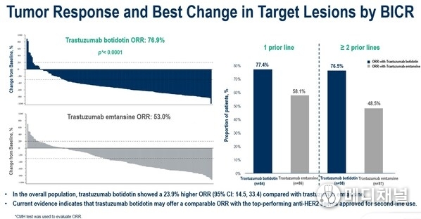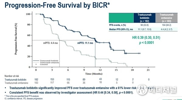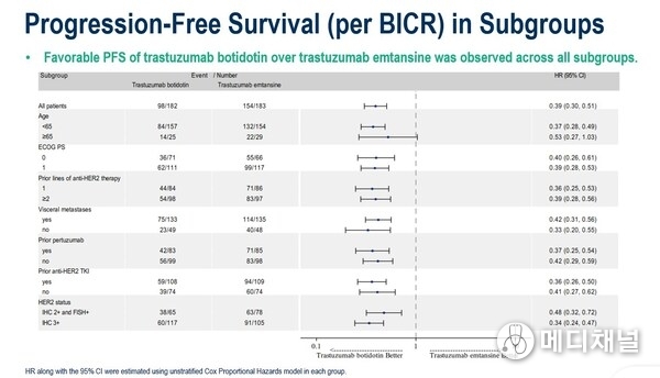 Median PFS was significantly longer in trastuzumab botidotin than in T-DM1 (11.1 months vs 4.4 months; HR: 0.39, 95% CI, 0.30-0.51, p<0.0001). PFS benefit with trastuzumab botidotin was consistently observed regardless of prior lines of anti-HER2 therapy (HR 0.36, 95% CI, 0.25-0.53, for 1 prior line; HR 0.39, 95% CI, 0.28-0.56, for ≥2 prior lines).