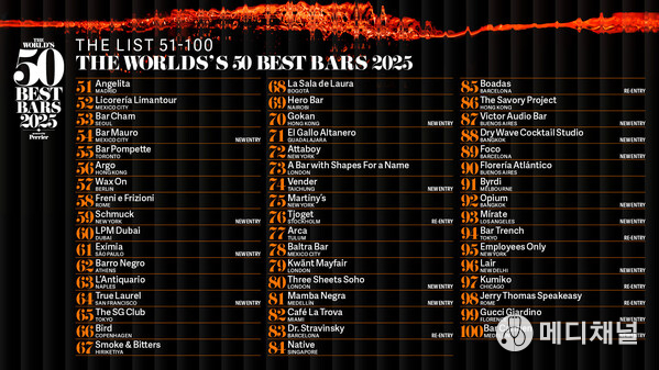 ロンドン, 2025年9月24日 -- The World's 50 Best Bars 2025(スポンサー:Perrier)まで残り2週間となる中、No.51からNo.100までにランクインしたバーが9年連続で発表されました。毎年発表されるこのリストは、バーテンダー、教育者、ドリンク専門のライターを含む800名以上の独立した専門家による投票によって作成されています。