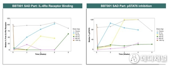 - Rapid, complete, and sustained IL-4Rα binding and pSTAT6 inhibition observed through Week 8+ following a single dose of BBT001.