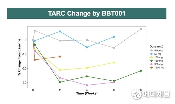 - An unprecedented, dose-dependent, rapid, deep, and sustained reduction in TARC levels after a single dose of BBT001, with potent suppression maintained through Week 8+.