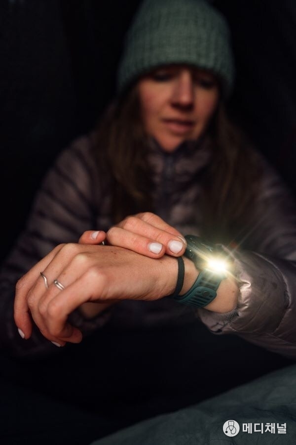 A practical addition for outdoor use, the integrated LED flashlight in the bezel offers adjustable brightness, a red-light mode for night vision, and safety functions such as SOS, breathing and alert, providing light when it is needed most, whether in a tent, on a trail, or during an emergency.