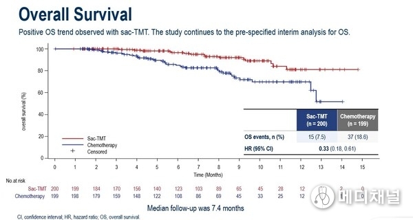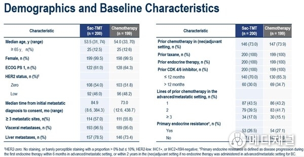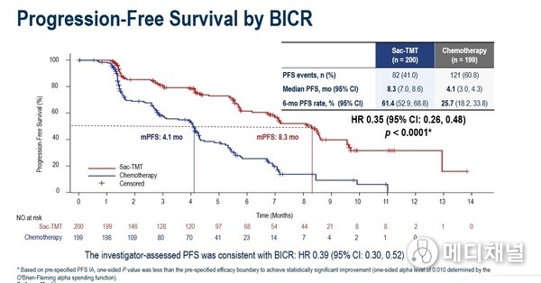As at the data cut-off date January 22, 2025, the median PFS was significantly longer in sac-TMT than in ICC (8.3 vs. 4.1 months; HR, 0.35; 95% CI, 0.26-0.48; P<0.0001). Clinical benefit was seen in sac-TMT independent of HER2 expression (HR for PFS in HER2-zero: 0.39, 95% CI, 0.26-0.57; in HER2-low: 0.31, 95% CI, 0.20-0.48).