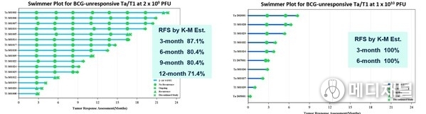 - Among 16 evaluable patients with BCG-unresponsive papillary who received MVR-T3011 at a dose of 2x109 PFU, the 3-month, 6-month, 9-month and 12-month recurrence-free survival (RFS) rates were 87.1%, 80.4%, 80.4% and 71.4%, respectively. Among 6 evaluable patients who received MVR-T3011 at a dose of 1x1010 PFU, 100% of patients remained recurrence free at Month 3 and Month 6.