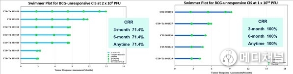 The patients were enrolled and treated with intravesical MVR-T3011 at two dose levels: 2x109 PFU and 1x1010 PFU in this study. There were a total of 26 patients with papillary (16 patients at the dosage level of 2x109 PFU, 10 patients at the dosage level of 1x1010 PFU), and a total of 12 patients with carcinoma in situ (CIS) (7 patients at the dosage level of 2x109 PFU, 5 patients at the dosage level of 1x1010 PFU) enrolled in this trial. Data from the patients demonstrated a promising efficacy profile: