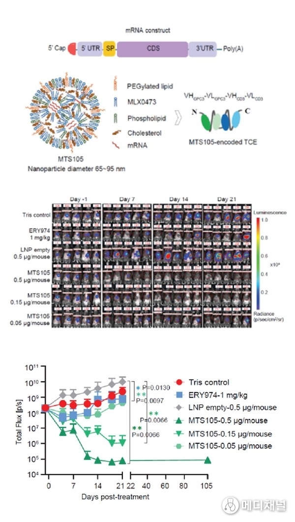 MTS-105 is a first-in-class mRNA-encoded T cell engager (TCE) therapy candidate for hepatocellular carcinoma (HCC), delivered via METiS's proprietary liver-targeted LNP system. Study results demonstrate that, once delivered to and taken up within the liver, the mRNA is translated in situ and secreted locally as high level of bispecific antibodies, which rapidly penetrate HCC tissues. Employing this "Trojan Horse" strategy, MTS-105 efficiently activates T cells within the tumor to induce tumor cell killing, achieving complete tumor clearance and long-term T cell immune memory in mouse models.