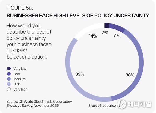 전체적으로 54%는 무역 성장이 2025년보다 빠를 것으로 예상했고 40%는 동일할 것으로 내다봤다. 이는 53%가 정책 불확실성이 높거나 매우 높을 것으로 예상하고 90%가 무역 장벽이 높아지거나 변동이 없을 것으로 예상하는 가운데 나온 결과다. 자사의 비즈니스에 부정적인 영향이 있을 것으로 예상한 응답자는 25%에 불과했으며 49%는 영향이 없을 것으로, 26%는 오히려 긍정적으로 내다봤다.