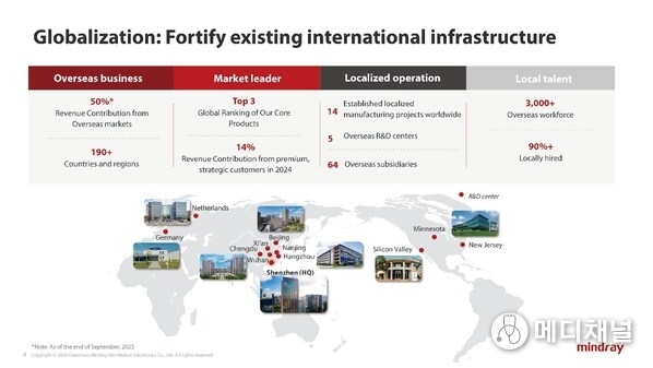 With a 25-year foundation in global business, Mindray has built a robust international infrastructure spanning over 40 countries, including 64 subsidiaries, 5 R&D centers, and 14 manufacturing facilities. Its international workforce has grown to over 3,000 employees, 90% of whom are locally recruited, supporting a 15% compound annual growth rate in international business over the past decade. Currently, international revenue accounts for 50% of the company's total, and Mindray aims to increase this proportion to over 60% through further investment in localization.
