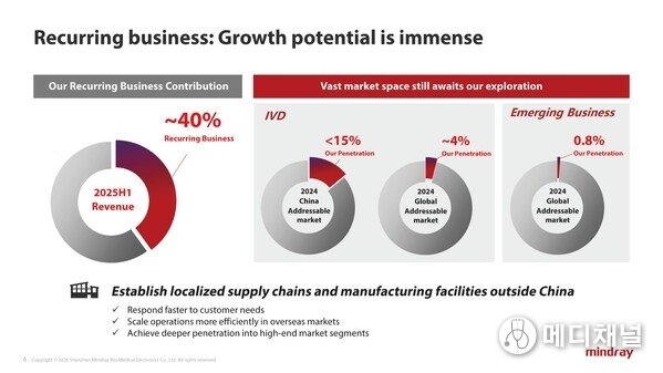 Recurring business, including IVD reagents, high-value consumables, IT solutions, and customer services, already contributed 40% of Mindray's total revenue in the first half of 2025. The company targets lifting this contribution to over 50%, leveraging significant growth potential in underpenetrated markets. In 2024, Mindray held less than 15% market share in China's addressable IVD market and around 4% globally, while its share in the global minimally invasive surgery (MIS) and minimally invasive intervention (MII) markets was only 0.8%.