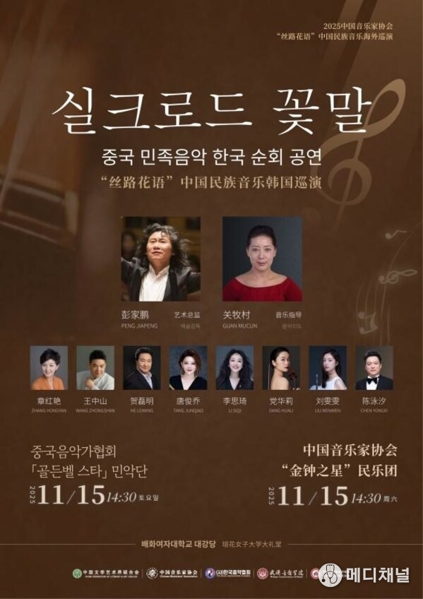 [ 메디채널 김장윤(JASON KIM) 기자 ] 선전, 중국 2025년 11월 26일 -- 중국음악가협회(Chinese Musicians' Association)의 주관하에 '골든벨스타(Golden Bell Stars)' 현대식 중국 연주단이 한국에서 '실크로드의 꽃비(Silk Road Blossoms)'라는 제목의 중국 민속 음악 순회공연을 성황리에 마쳤다.