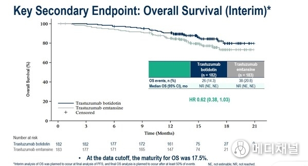 A trend toward benefit in OS was observed in trastuzumab botidotin (HR 0.62; 95% CI, 0.38-1.03).