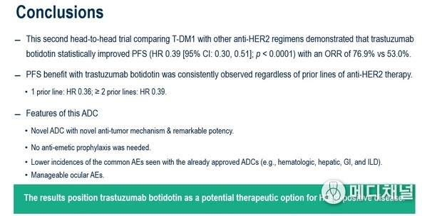 Median PFS was significantly longer in trastuzumab botidotin than in T-DM1 (11.1 months vs 4.4 months; HR: 0.39, 95% CI, 0.30-0.51, p<0.0001). PFS benefit with trastuzumab botidotin was consistently observed regardless of prior lines of anti-HER2 therapy (HR 0.36, 95% CI, 0.25-0.53, for 1 prior line; HR 0.39, 95% CI, 0.28-0.56, for ≥2 prior lines).