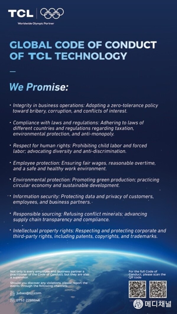 The Global Code of Conduct of TCL Technology Group Co., Ltd. (hereinafter referred to as the "Code of Conduct") represents a significant step in strengthening the company's corporate governance by establishing clear standards for ethical business conduct and employee accountability worldwide. The Code of Conduct applies to all employees and management members of TCL Technology as well as its subsidiaries and branch entities across the world. TCL Technology also actively encourages suppliers and business partners to adhere to the Code of Conduct, fostering a unified commitment to responsible and transparent business practices.