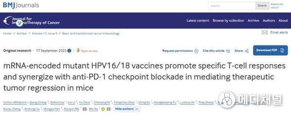 On September 17, JITC published: "mRNA-encoded mutant HPV16/18 vaccines promote specific T-cell responses and synergize with anti-PD-1 checkpoint blockade in mediating therapeutic tumor regression in mice."