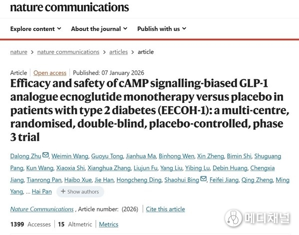 HANGZHOU, China, Jan. 28, 2026 -- Recently, the results of the pivotal Phase III clinical trial (EECOH-1) of ecnoglutide injection, developed by Sciwind Biosciences Co., Ltd. ("Sciwind"), for the monotherapy of type 2 diabetes (T2DM), have been published in Nature Communications. Conducted in adult T2DM patients with inadequate glycemic control after diet and exercise intervention, the results demonstrate that ecnoglutide injection — potentially the world's first long-acting cAMP-biased GLP-1 receptor agonist — significantly lowers blood glucose while also showing comprehensive benefits including weight reduction and improvement of metabolic parameters.