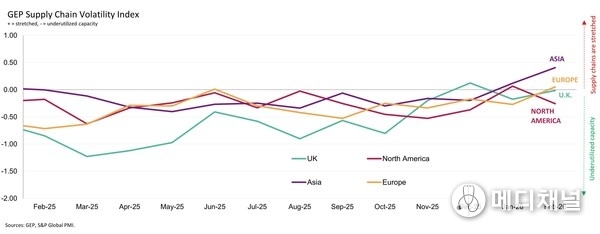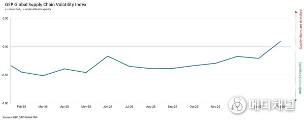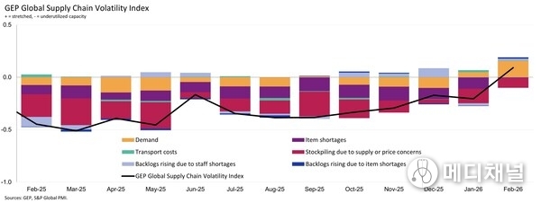 CLARK, N.J., March 11, 2026 -- GEP Global Supply Chain Volatility Index — a leading indicator tracking demand conditions, shortages, transportation costs, inventories and backlogs, based on a monthly survey of 27,000 businesses — showed that worldwide purchases of raw materials, commodities and critical components rose at the fastest pace in almost four years. Underlying data suggest the upturn was broad-based across sectors, with procurement activity rising in both capital-intensive and consumer-facing industries, pointing to a cyclical upswing prior to the war in the Middle East.